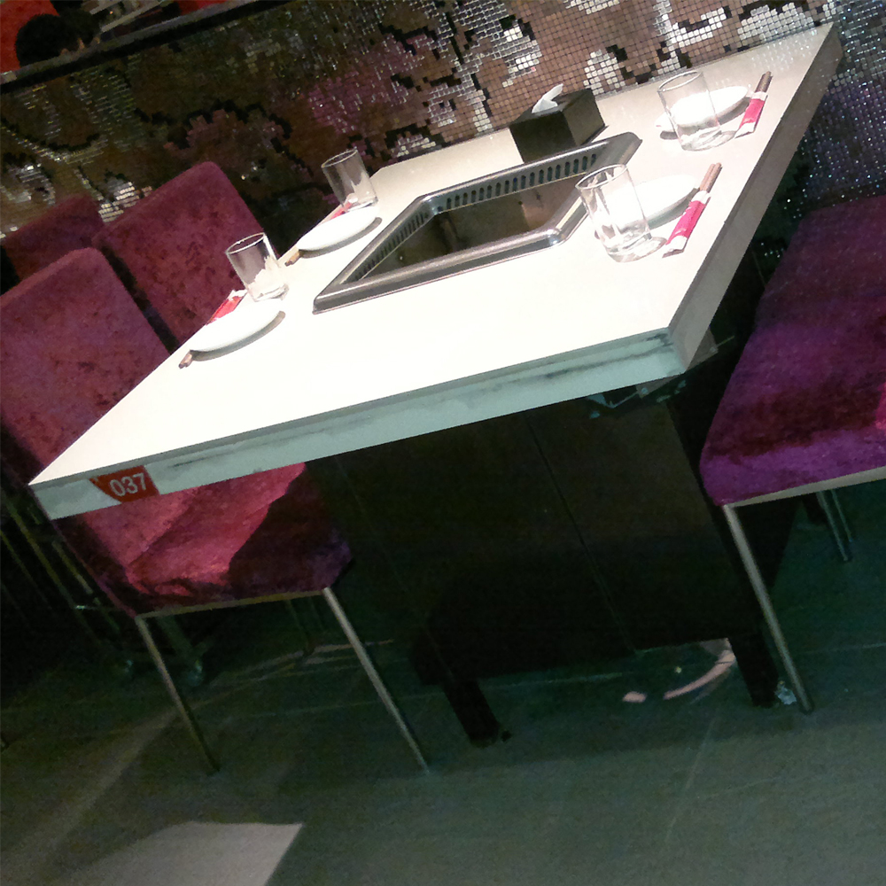 , solid wood hot pot tables set 4717. Produce and custom marble hot pot tables furniture, marble hot pot tables top materials is marble or quartz stone,with black plywood frame with storage part hotpot tables base, show as images. Our factory can customize and produce , and furniture as your demand, such as the color, size and style.